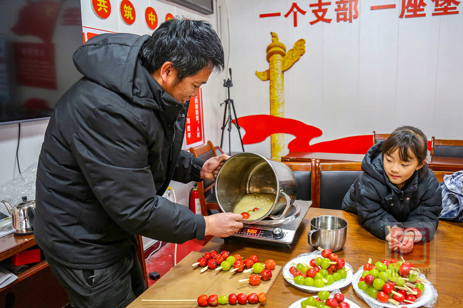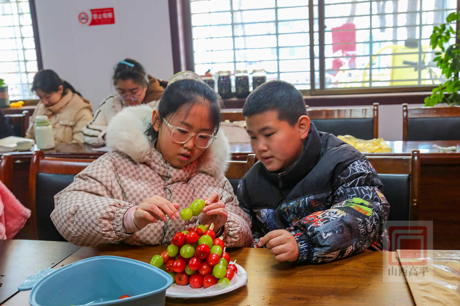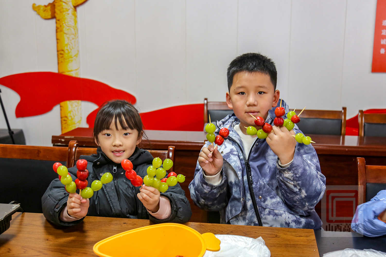 “我串了圣女果和山楂的糖葫芦,裹上糖之后亮晶晶的,特别好看,吃起来酸酸甜甜,美味极了。”小朋友秦悦童高兴地说。