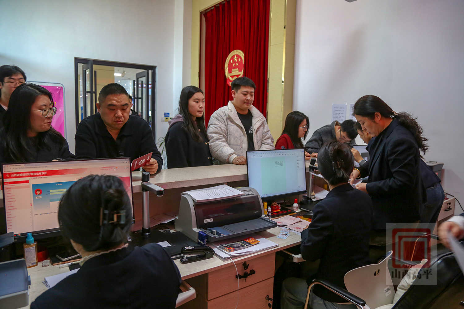 上午9时,在市政务服务中心的婚姻登记处,一对对新人们牵手相伴,等待领取结婚证。在工作人员的引导下,新人们一一递交材料、填写信息、办理登记。当拿到象征着爱情与责任的“红本本”时,新人们脸上洋溢出幸福的笑容。