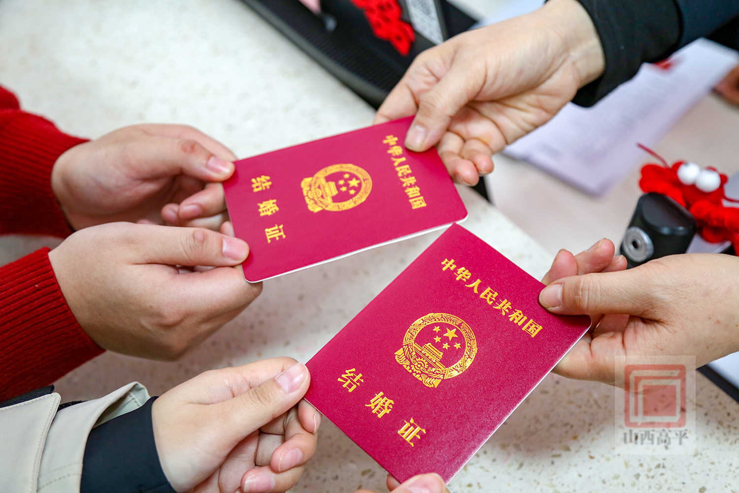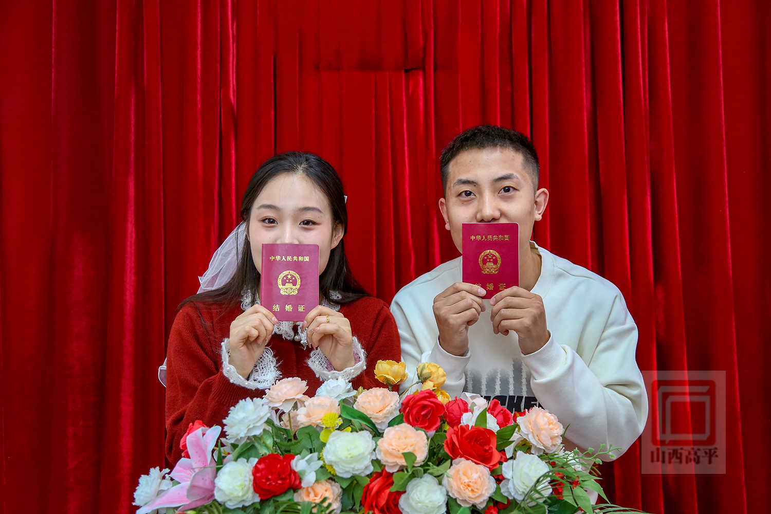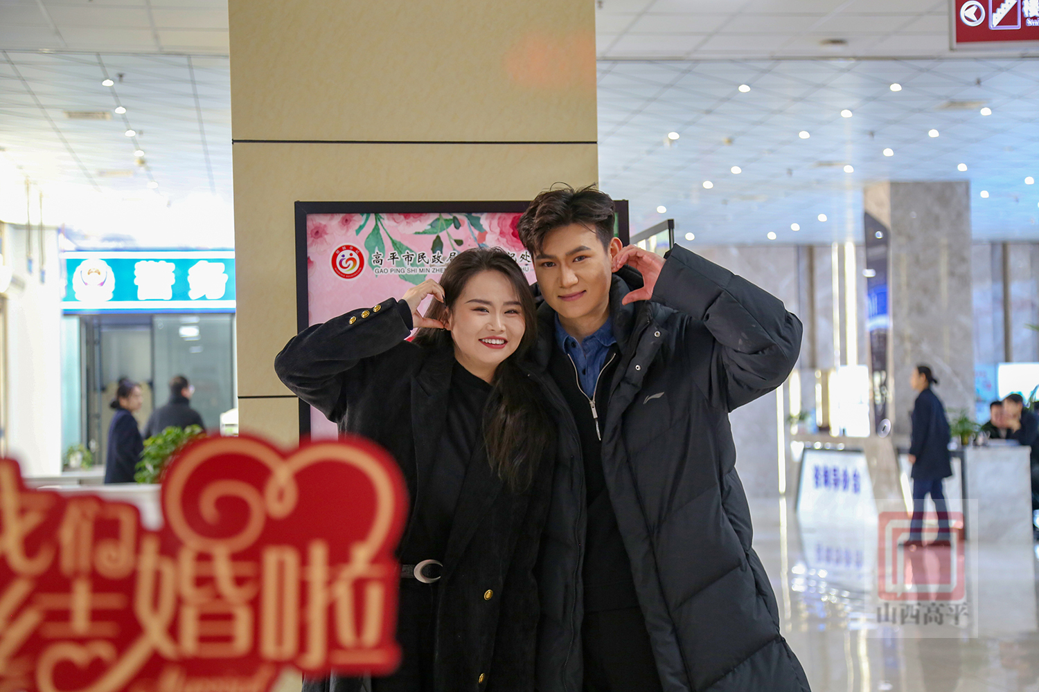 新人吕怡颖、申重阳说:“我们已经相识5年了,提前预约了情人节这天登记,马上也要过年了,希望在以后的每一天,我们都携手把日子过得红红火火。”