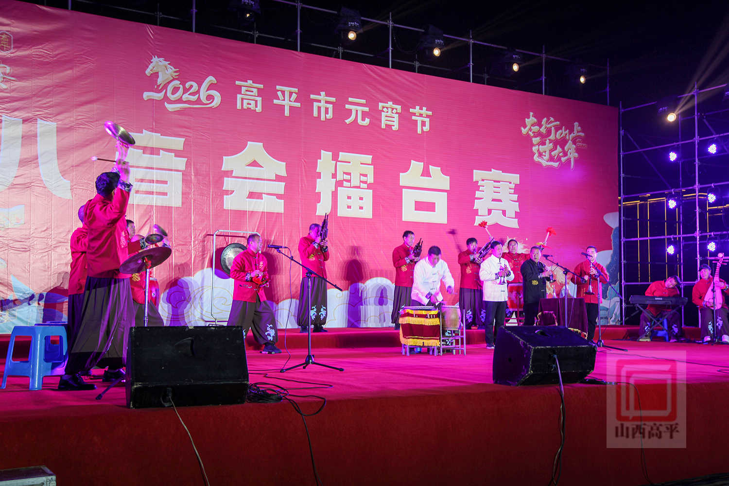 晚上8点,炎帝文化苑华灯闪烁、流光溢彩,鼓乐齐鸣、热闹非凡。参演队伍身着盛装,精神抖擞,吹拉弹奏各展绝活,依次献上《万花灯》《八音润寺庄・欢歌庆新春》《大德胜》《富硒福地闹元宵》《欢天喜地闹新春》等八音会演奏。锣鼓铙钹、上下翻飞,唢呐笙箫婉转悠扬、余韵绵长,精湛娴熟的演奏,尽显民间艺人深厚功底与八音会独特艺术魅力。