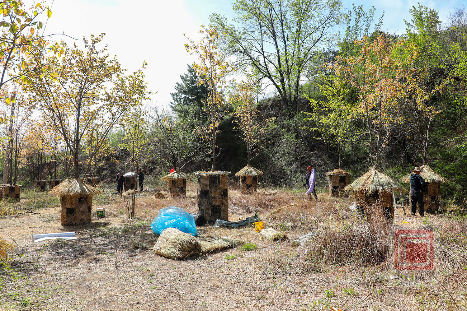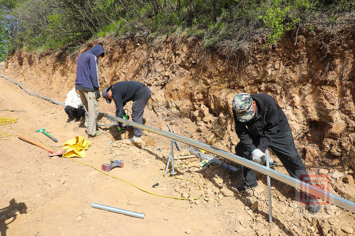 四月的南河村,山花烂漫,生机盎然。山林间,工人师傅们正抢抓春日好时节,分散在各个作业点,顺着山势有序开展路基修整、石阶铺设、草屋搭建等作业,处处一派热火朝天的春日施工景象。