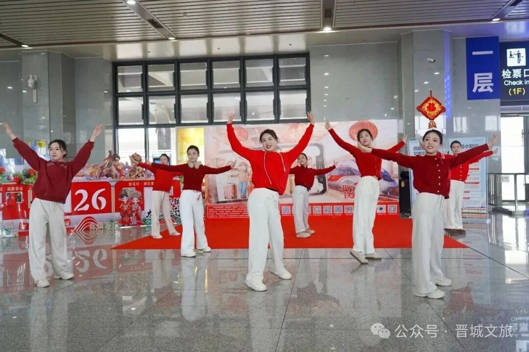 上午10点,候车厅内暖意融融。伴随着欢快的背景音乐,一场活力四射的快闪舞蹈突然亮相,身着盛装的演员们用灵动的舞姿瞬间点燃现场氛围。