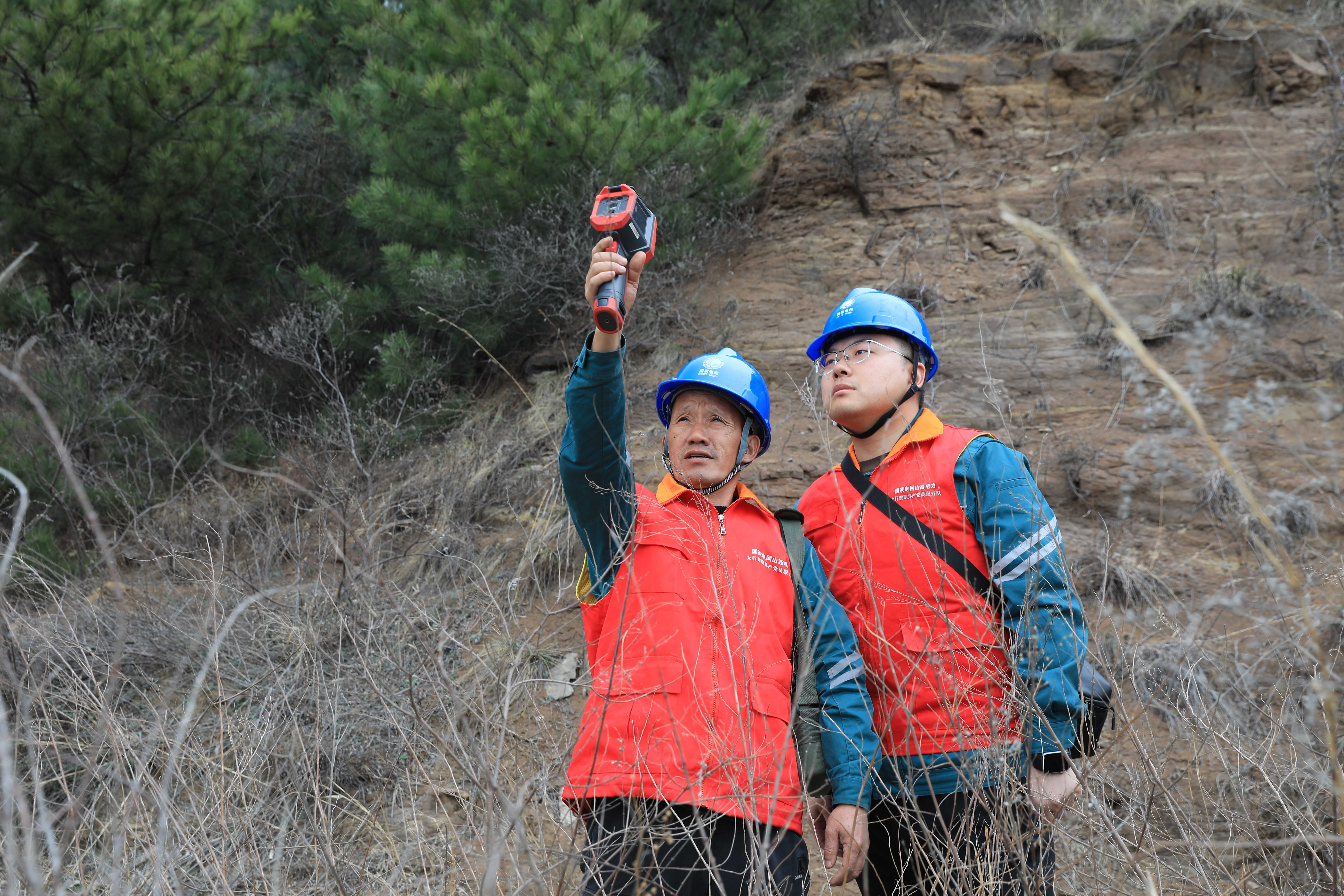 3月26日,在山西省高平市野川镇圪台山上,高平供电公司野川供电所3名运维人员头戴安全帽、身着红马甲,行走在春日山林间。他们或手持测温仪,或高举望远镜,或起飞无人机,仔细对穿越林区的10千伏867吴庄线供电设备进行巡视检查。