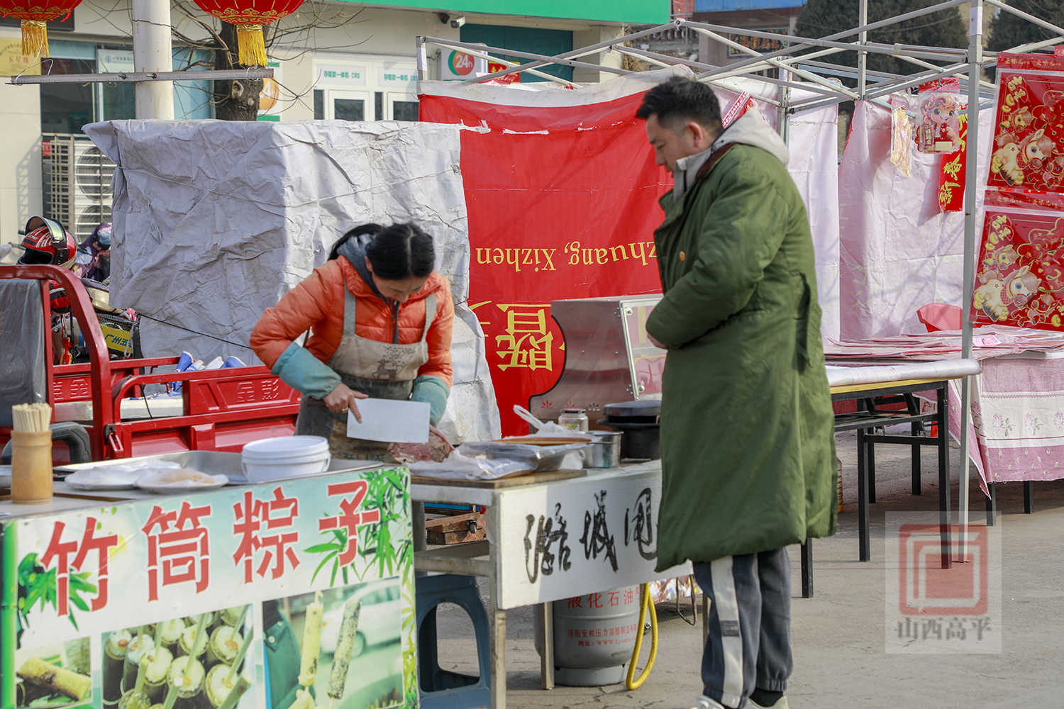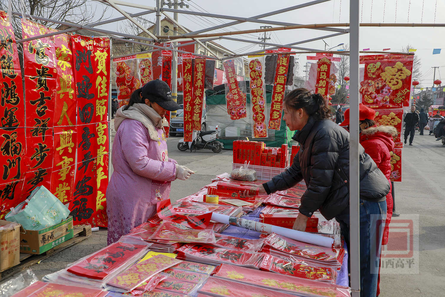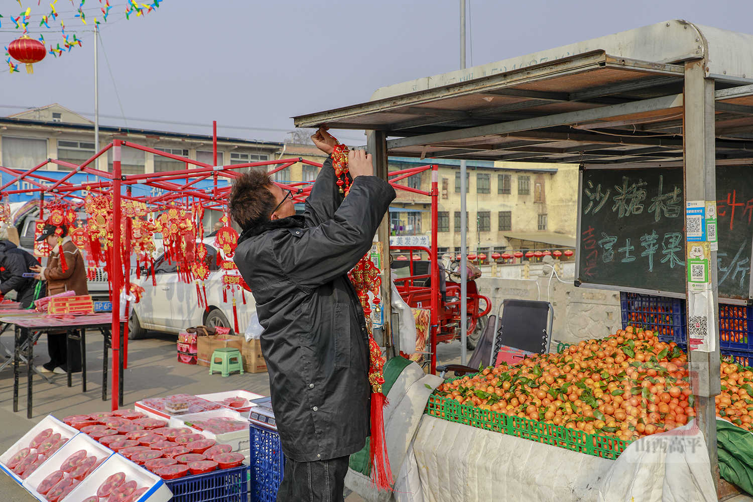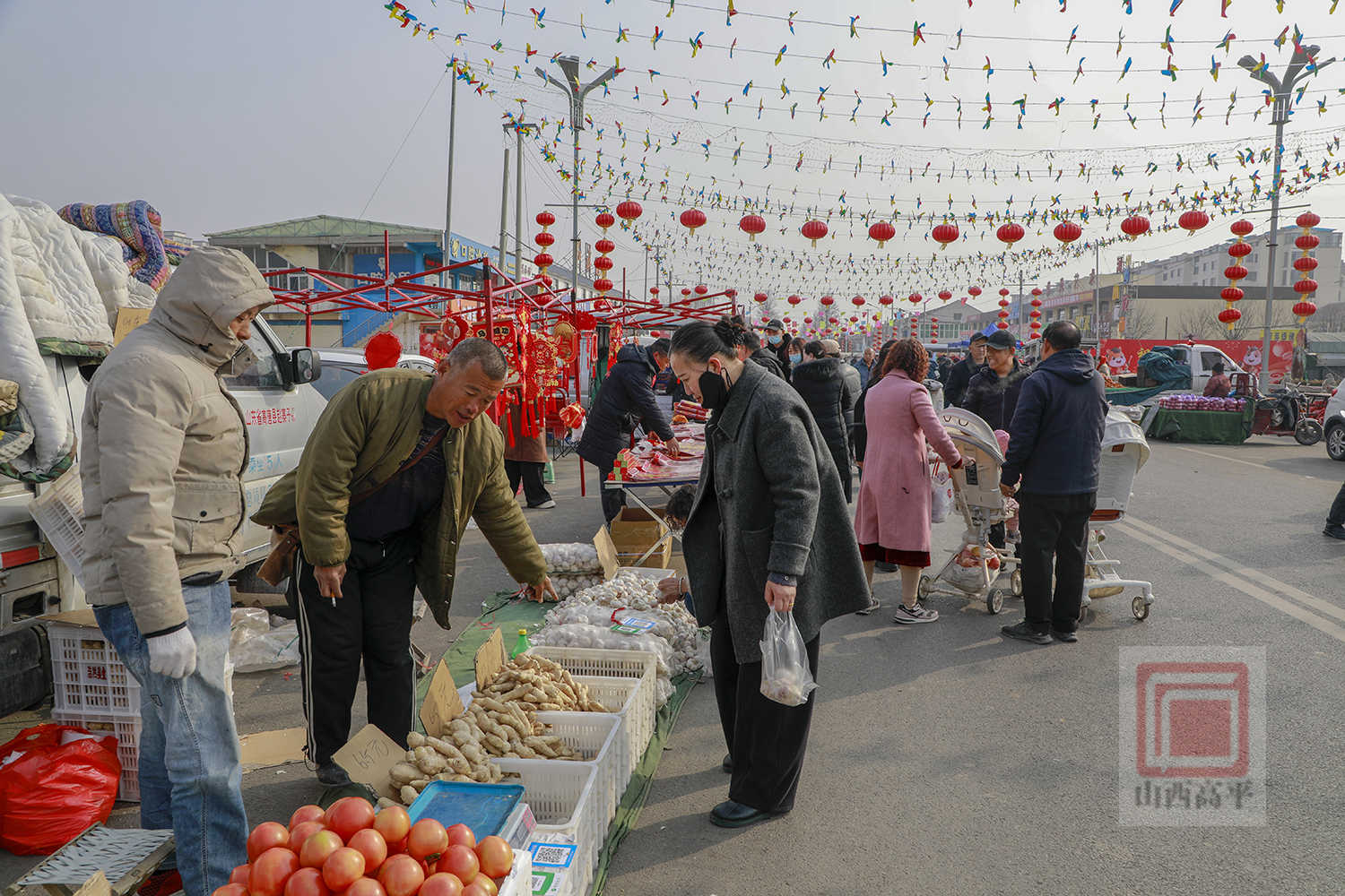 在年货节市场,人潮涌动,热闹非凡。200余家商户沿街排开,各类年货琳琅满目、一应俱全。红彤彤的春联福字、寓意吉祥的灯笼年画挂满摊位,映红了整条街巷。糖果炒货、生鲜果蔬、日用百货等整齐摆放,满足了村民们一站式的年货采购需求。