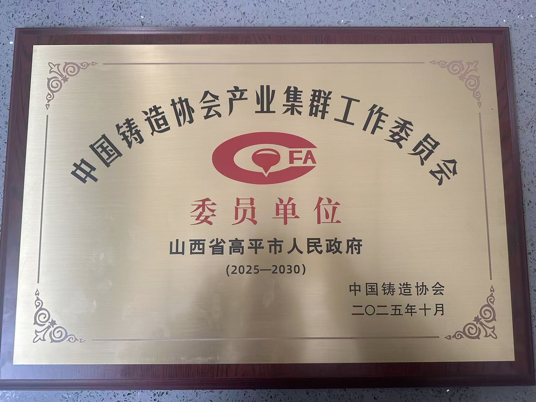 高平获授中国铸造协会产业集群工作委员会委员单位