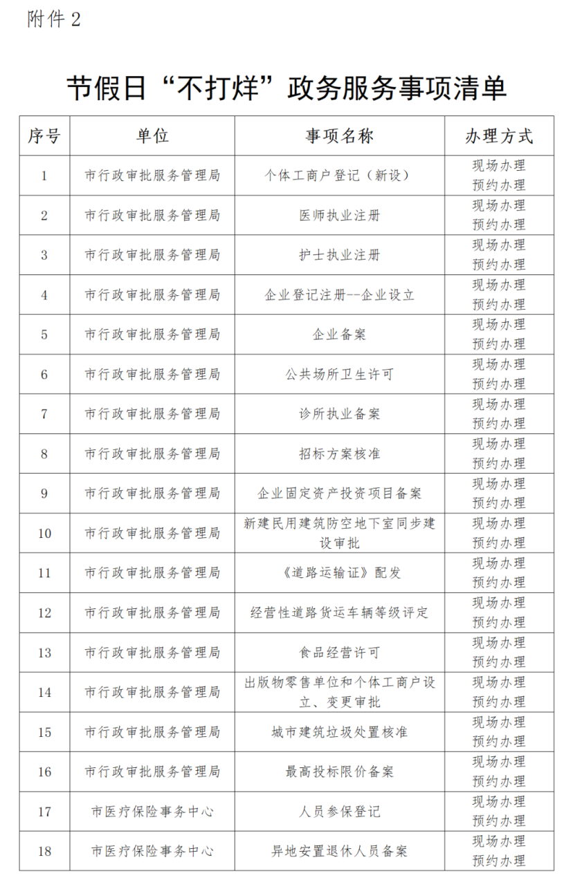1. 预约办理。企业和群众提前1天,通过拨打政务大厅节假日“不打烊”集中服务窗口电话或各窗口咨询电话(详见附件1)预约办理相关事项。预约时间(上午9:00—11:30,下午2:30—5:00),办事窗口按预约时间提供服务。