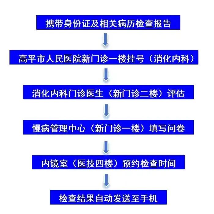 5. 报名方式:携带本人身份证及相关病历检查报告到高平市人民医院消化内科门诊进行问诊评估,如果测评结果属于上消化道癌高危人员可免费内镜检查。