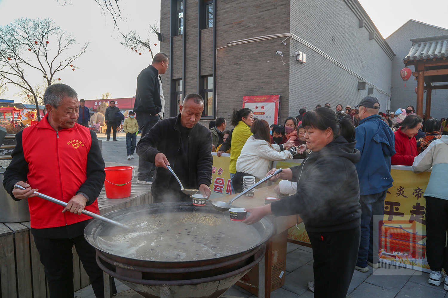 传统的土灶上,本地特产“秃玉茭”正在大铁锅里慢火熬煮,玉米和豆子在热锅里翻炒,这便是当地人称的“龙蛋”和“龙眼”。游客们喝着热气腾腾的“秃玉茭”,嘴里的玉米豆子越嚼越香,品尝着地道美味,胃里暖了,五谷丰登、平安顺利的好兆头也融进了心里。