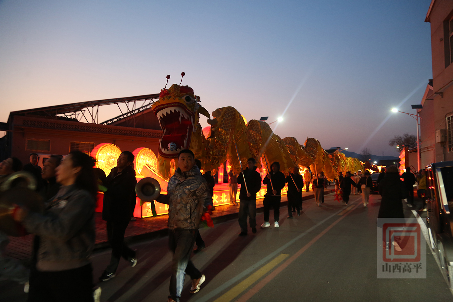 夜幕降临,在激昂的鼓点中,一条金色长龙在人群的簇拥下蜿蜒游动,游龙灯活动正式开始。大家跟随龙灯队伍穿行于街巷中,工作人员为参与者分发寓意“金豆开花、财源滚滚”的福豆福袋,将福气传递给每一个人。