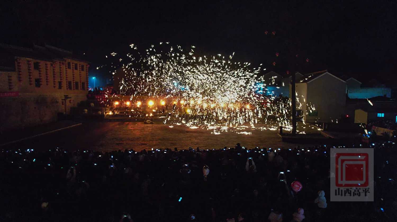 在社火广场,舞龙、锣鼓、扇子舞蹈轮番上演,点燃了现场观众的热情。在大家的翘首期盼中,千年非遗打铁花上演。表演者奋力挥臂,一勺勺滚烫的铁水被击打至高空,瞬间化作亿万朵璀璨的金色火花,如流星雨般散落,现场惊叹声、欢呼声此起彼伏。