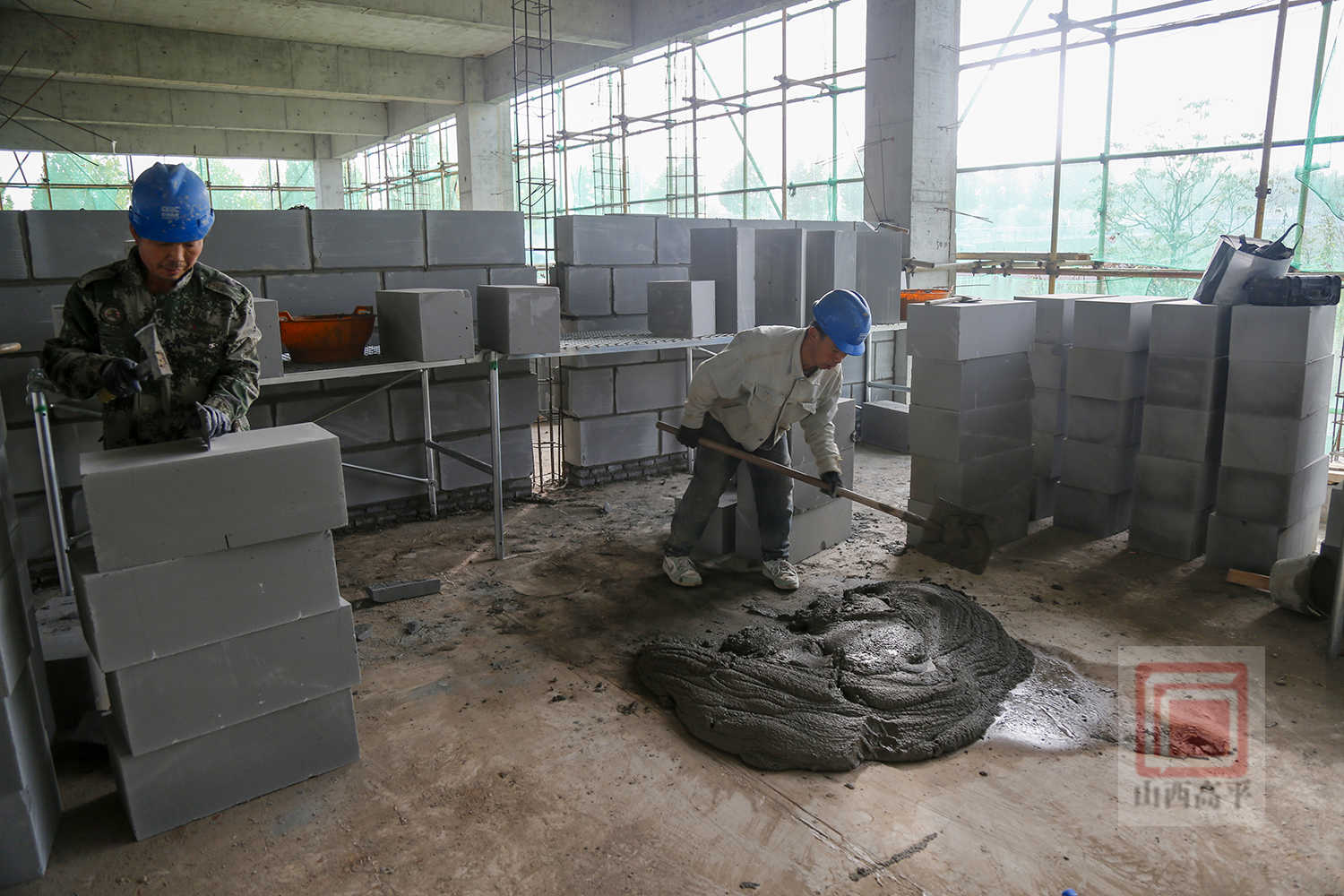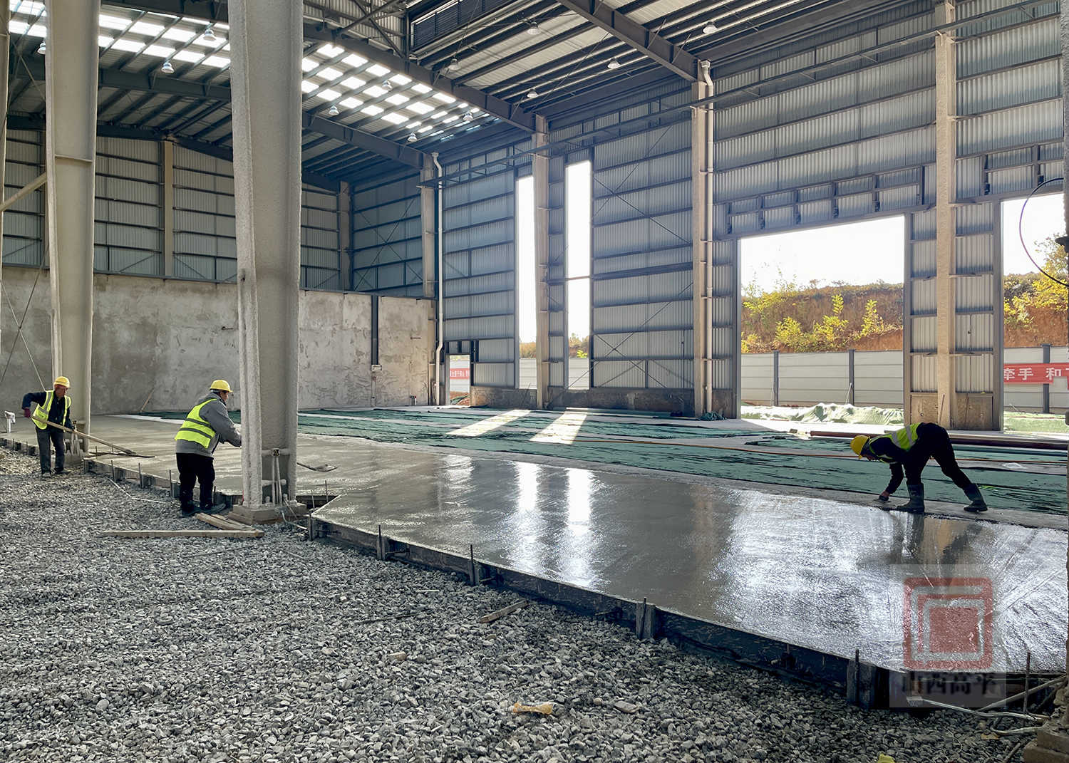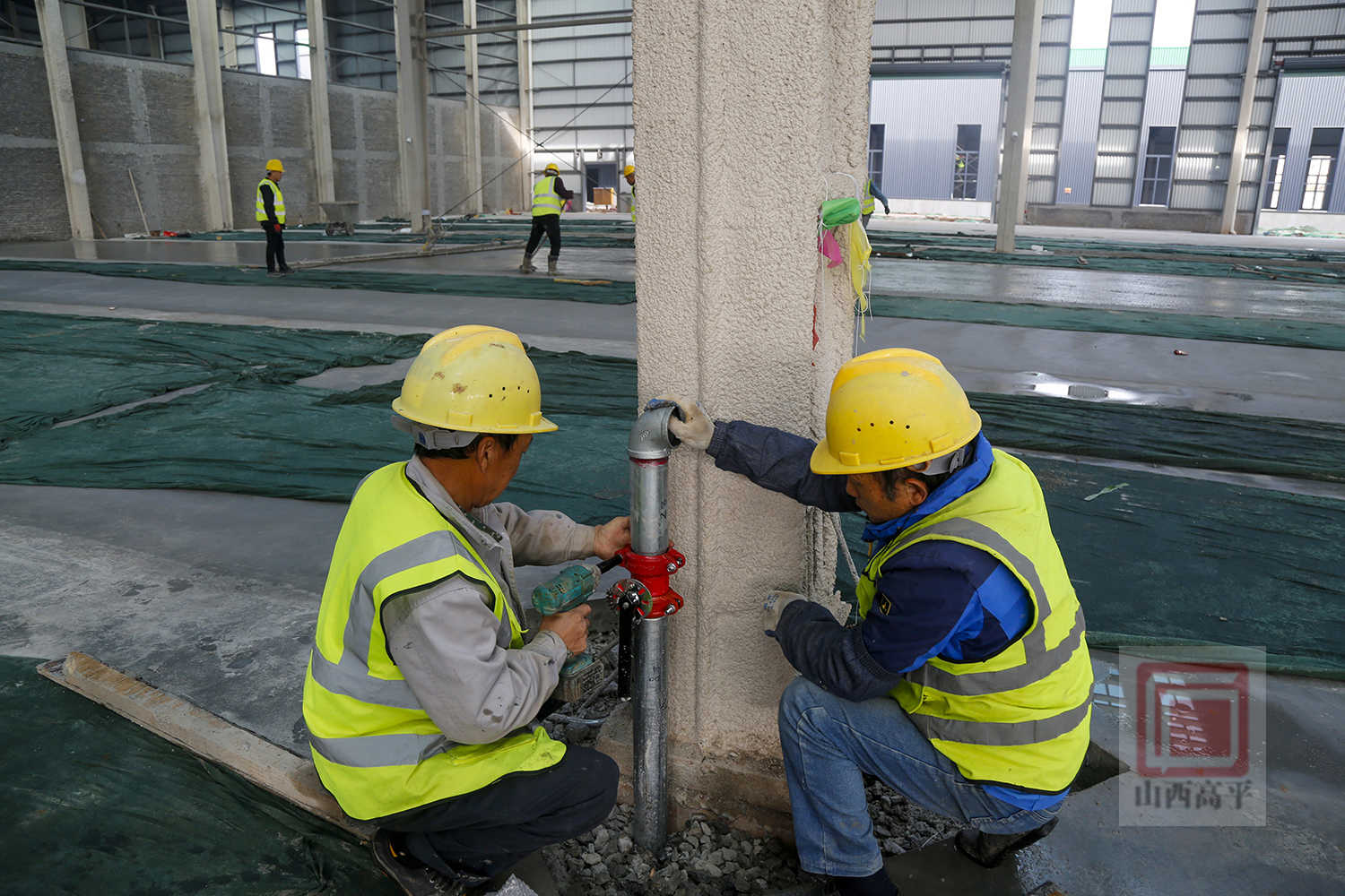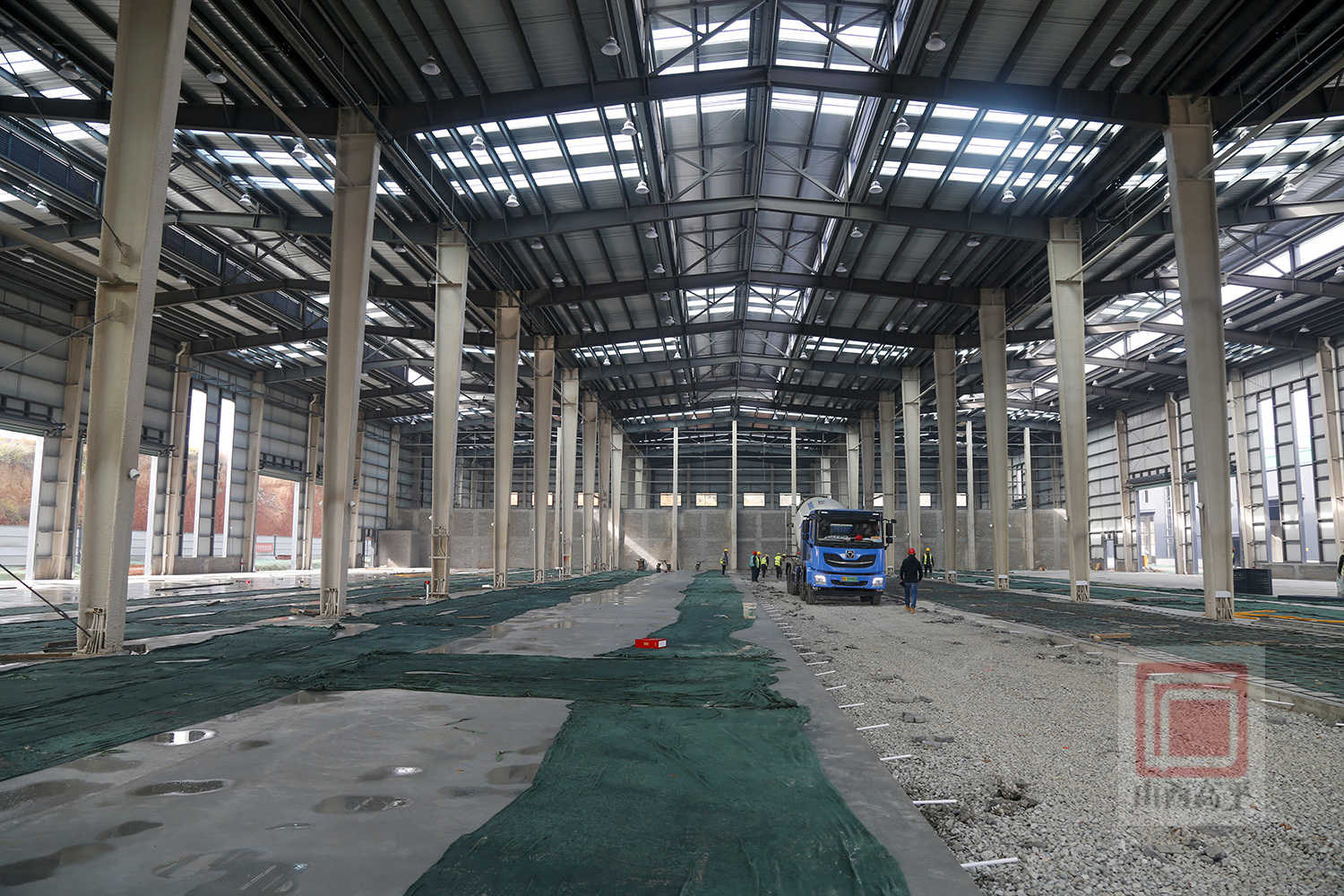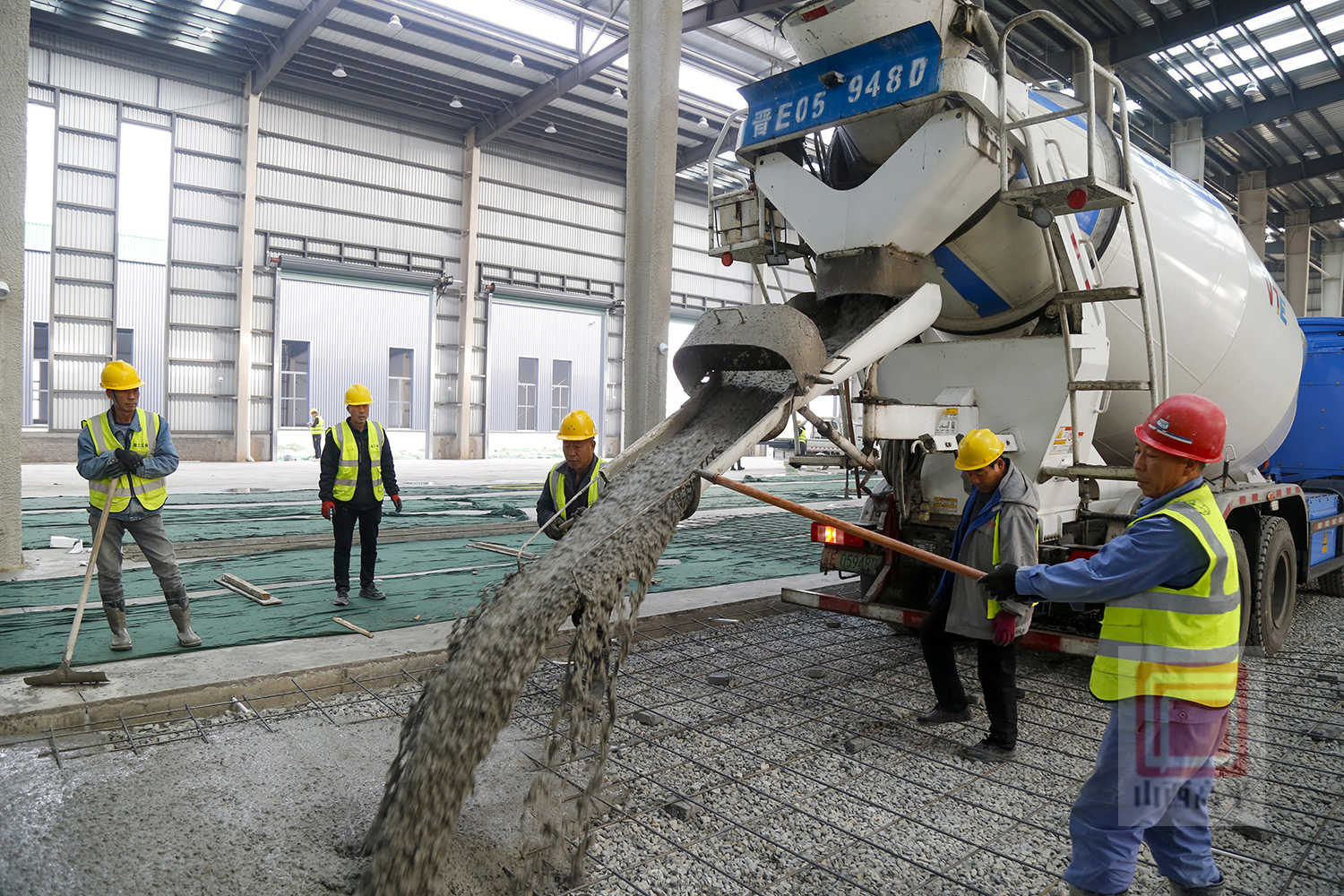 来到项目施工现场,只见资源化中心和各功能区的厂房主体结构已初具雏形,厂房内,工人师傅们分布在各个点位,加紧进行墙面抹灰、窗框安装、地坪浇筑等作业,呈现出一派如火如荼的施工景象。