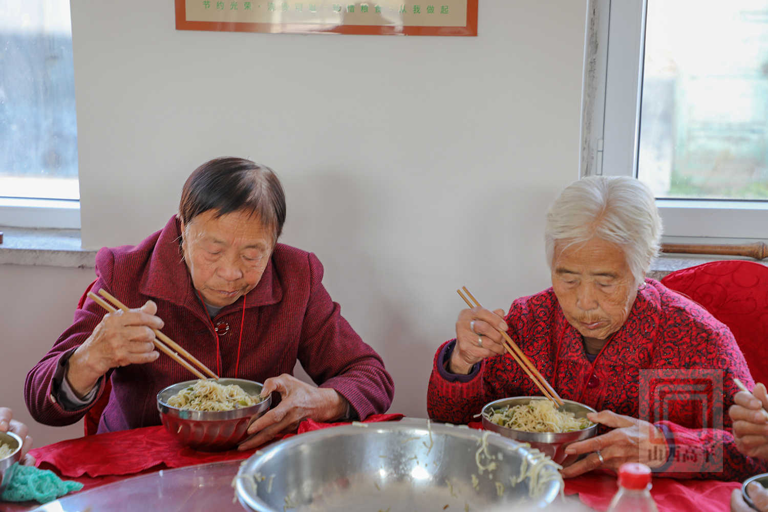 83岁的老人王松茂和老伴一边享用美味的饭菜,一边乐呵呵地说:“孩子都在外面,我俩年纪大了做饭不方便,每天来这里吃饭,80岁以上的老人一人只要一块钱就能吃饱,实惠又省心。”