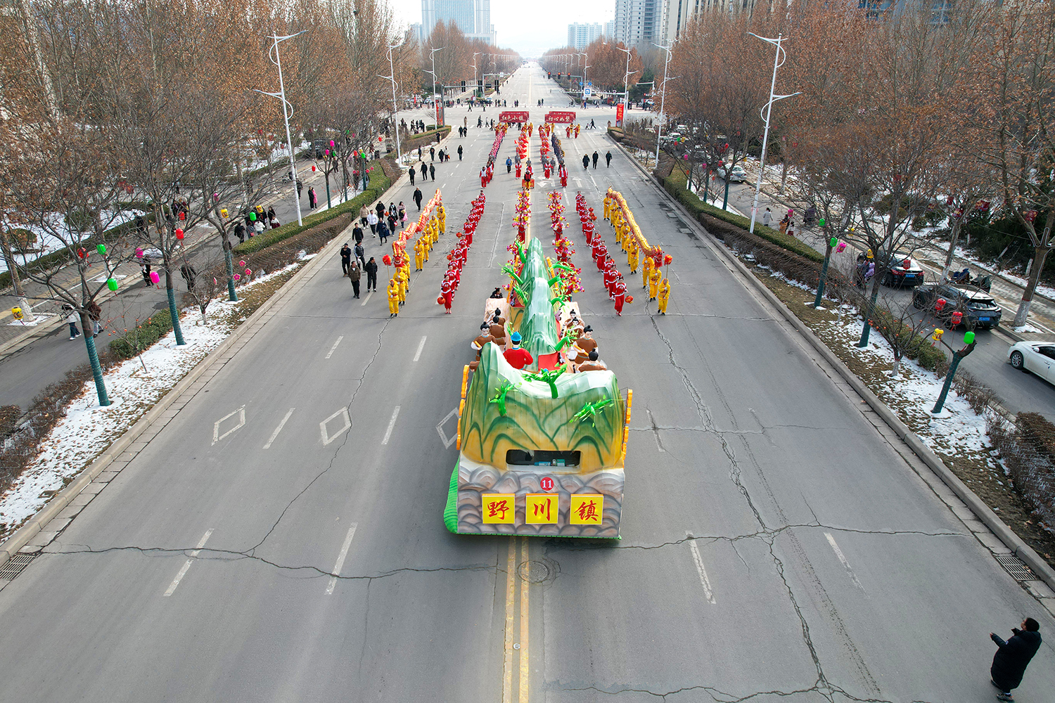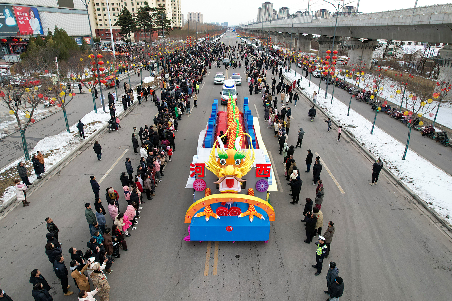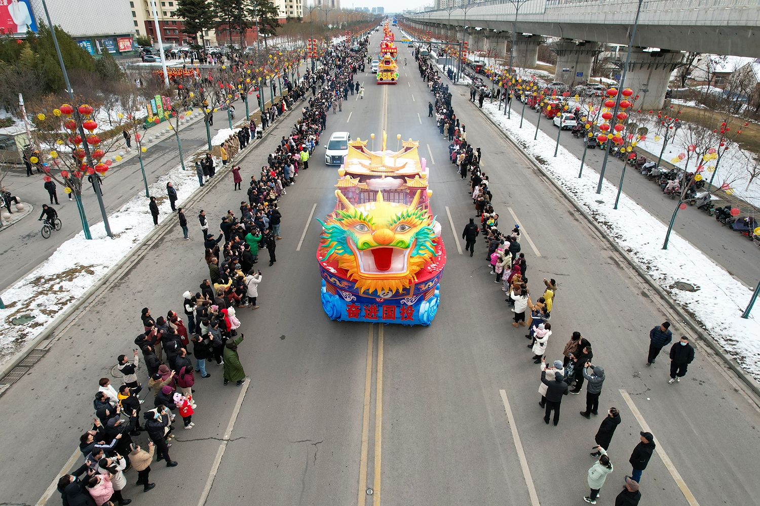 彩车围绕“新春新年新干劲”为主题进行设计并制作。两条巨龙昂首向前,立体玲珑的新春彩灯放置于彩车中央,直径两米的巨型大鼓放置于花车尾部,可谓是:双龙戏珠吉祥年,春回大地万物新。战鼓擂动声雄壮,北城儿女天下先!
